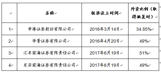截至目前,已根据CEPA 10获中国证监会核准设立的合资证券公司共四家,具体情况如下: