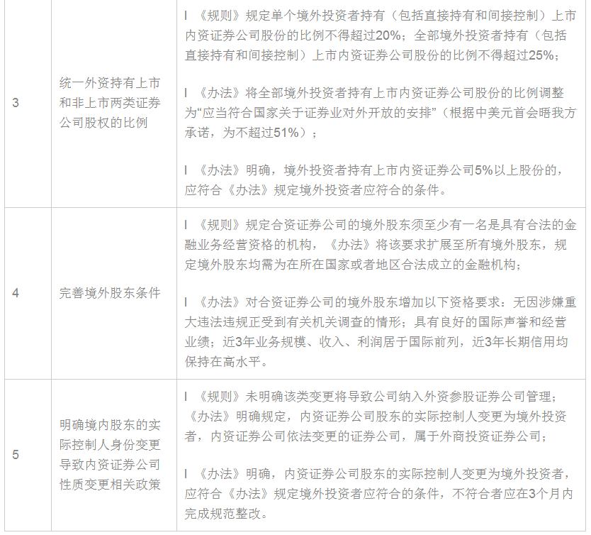2018年4月28日,《办法》经征求意见后正式颁布,《规则》同时废止。《办法》允许外资控股合资证券公司,放开合资证券公司业务范围,明确将境内股东实际控制人身份变更导致内资证券公司性质变更的合资证券公司纳入适用范围,并完善了境外股东需符合的条件。自《办法》发布之日起,符合条件的投资者可根据《办法》及相关行政许可服务指南的要求,向中国证监会提交变更公司实际控制人或者设立合资证券公司的申请材料。