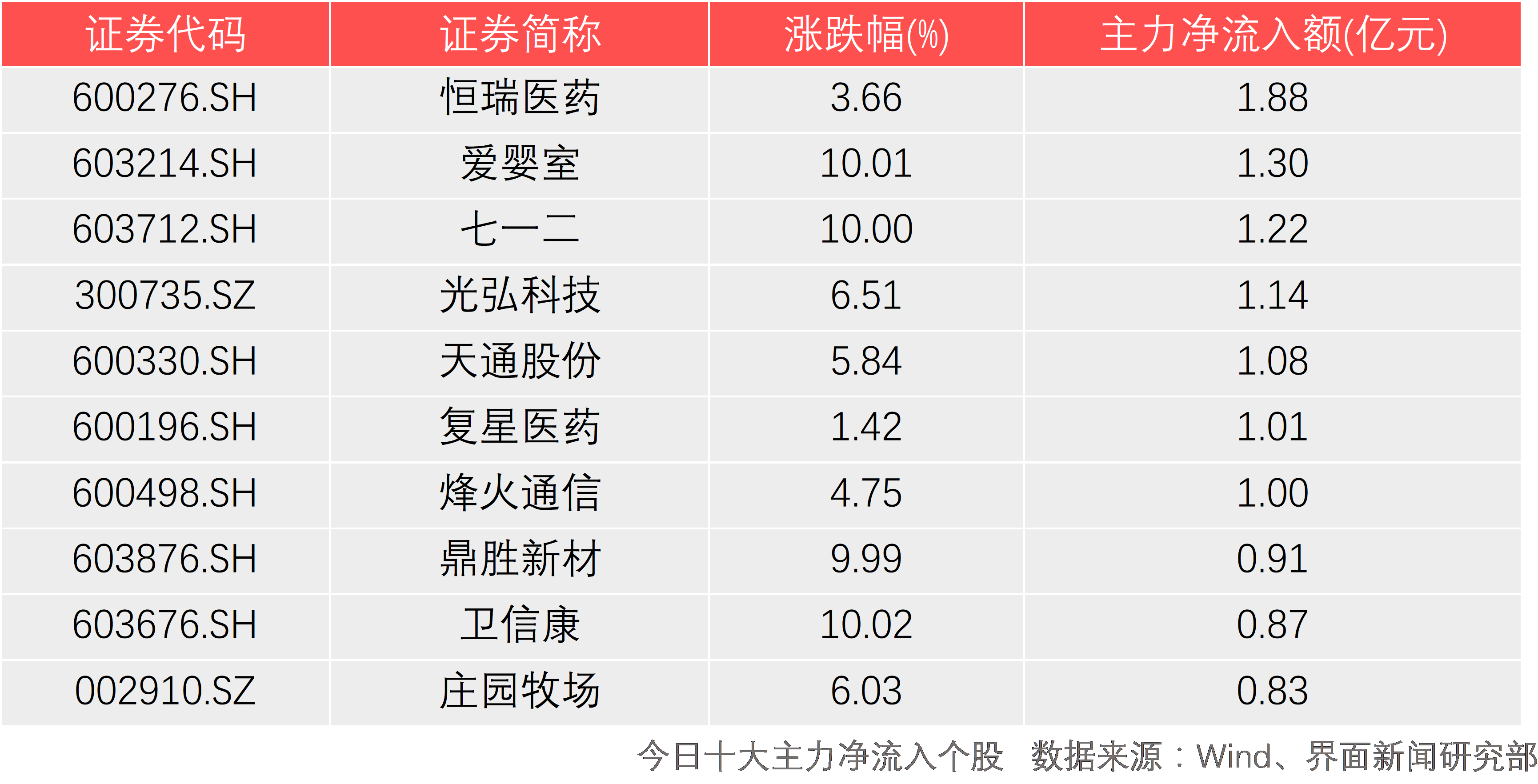从个股表现上来看,剔除封板新股,今日主力资金净流入排名前三的是恒瑞医药(600276.SH)、爱婴室(603214.SH)、七一二(603712.SH),分别净流入1.88亿元、1.30亿元、1.22亿元。今日盘面上医药板块强势,恒瑞医药、复星医药(600196.SH)获主力抢筹,卫信康(603676.SH)获主力青睐封板。二胎概念爱婴室,军民融合概念七一二、次新股鼎胜新材(603876.SH)获主力追捧涨停。