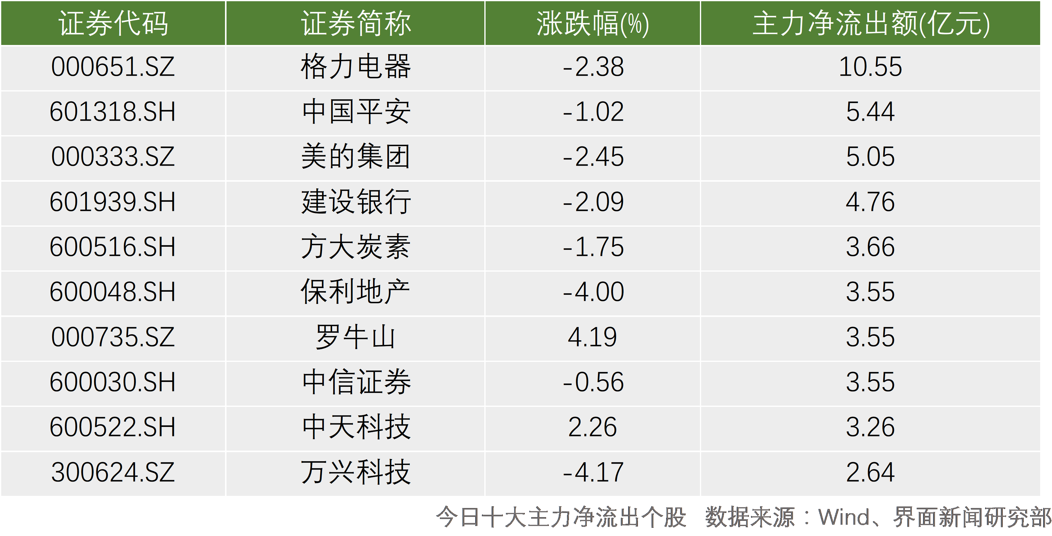 格力电器(000651.SZ)、中国平安(601318.SH)、美的集团(000333.SZ)成为主力资金今日重点抛售对象,分别净流出10.55亿元、5.44亿元、5.05亿元。今日盘面上地产、家电、保险股均表现不佳。罗牛山(000735.SZ)前日封板获主力2.62亿元净流出,而今日则有3.55亿主力离场。
