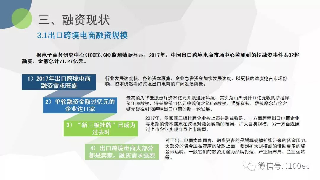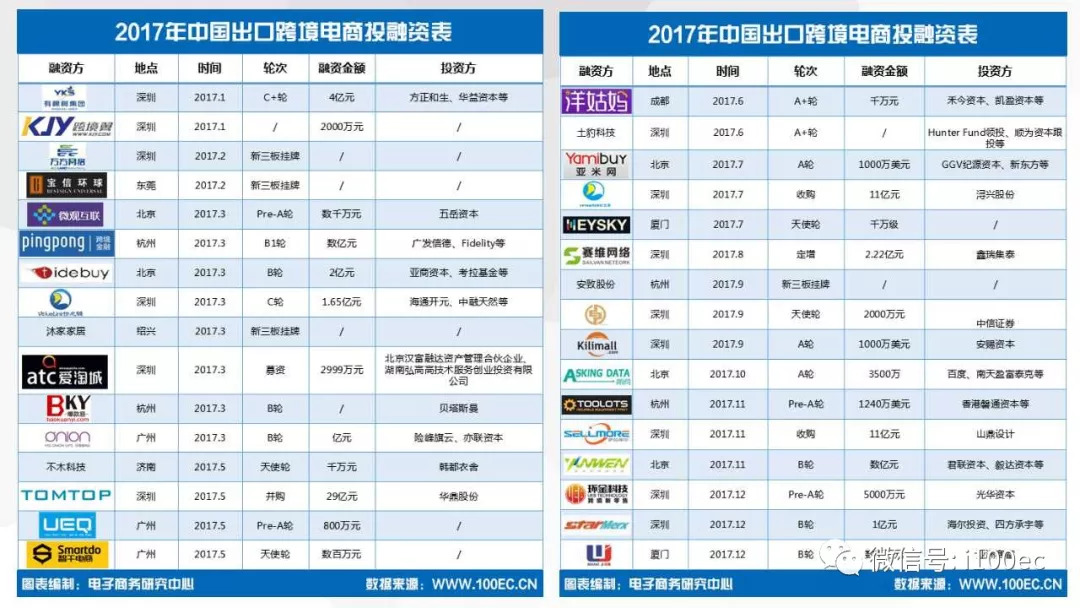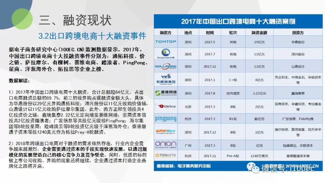 2017年中国出口跨境电商十大投融资事件分别为:通拓科技、价之链、萨拉摩尔、有棵树、赛维电商、踏浪者、PingPong、星商、洋葱海外仓、拓拉思等企业上榜。2018年跨境出口电商对于融资的需求依然存在,行业内企业竞争越来越激烈,企业需要通过资本的手段实现快速发展,以通过规模化的发展塑造自己的核心竞争力及竞争壁垒。同时,优质标的被上市公司收购、并购的现象还将继续,企业通过资本打造企业品牌化之路将开启。