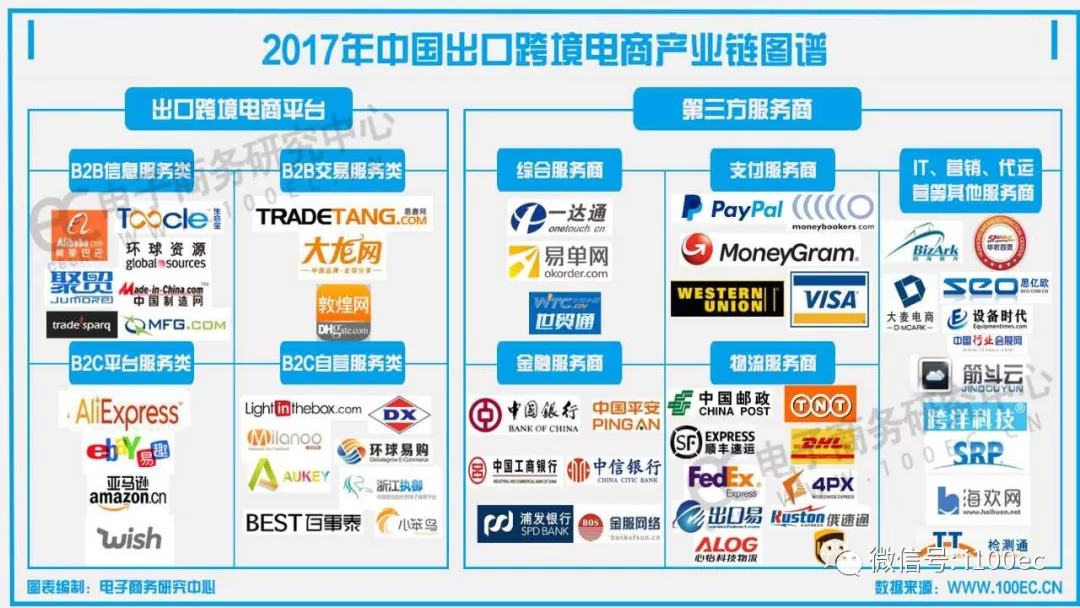 据报告发布的《2017年中国出口跨境电商行业产业链图谱》显示,目前出口跨境电商平台主要由以下几类构成:B2B类:阿里巴巴国际站、TOOCLE3.0(生意宝)、环球资源、中国制造网、MFG.com、聚贸、大龙网、敦煌网等。B2C类:全球速卖通、eBay、亚马逊、Wish、兰亭集势、DX、米兰网、跨境通、有棵树、Newegg新蛋、百事泰、海翼股份、通拓科技、傲基电商、执御、小笨鸟等。第三方服务企业:一达通、易单网、世贸通、Paypal、MoneyGram、中国银行、中国平安、中国邮政、UPS、TNT、顺丰、DHL、FedEx、递四方、出口易、四海商舟、大麦电商等。