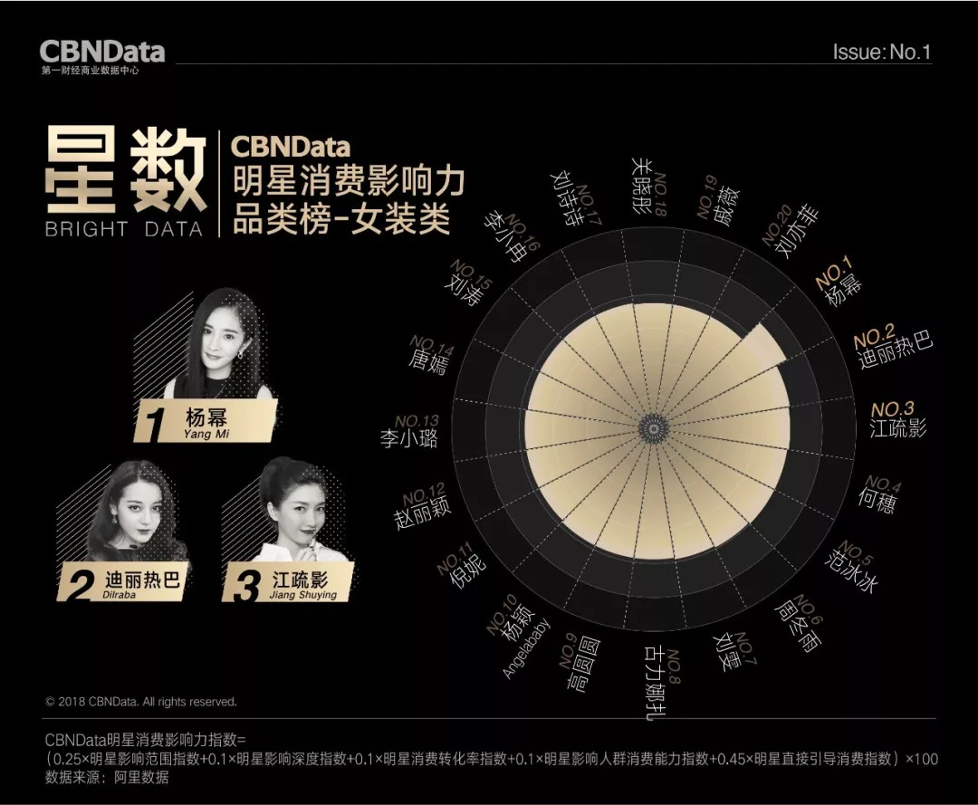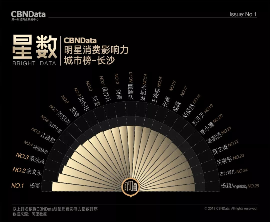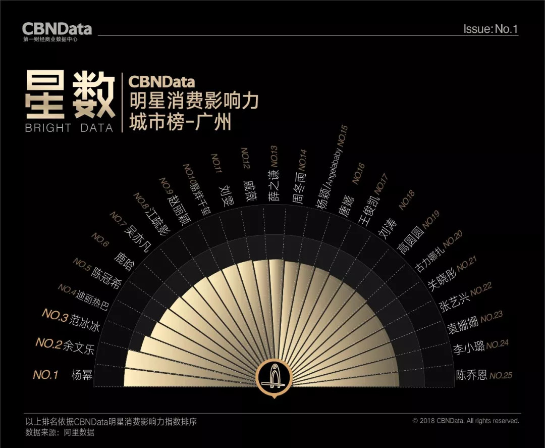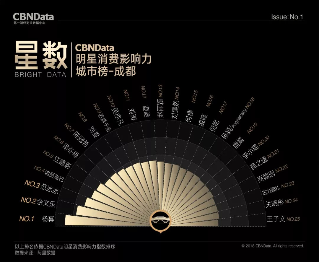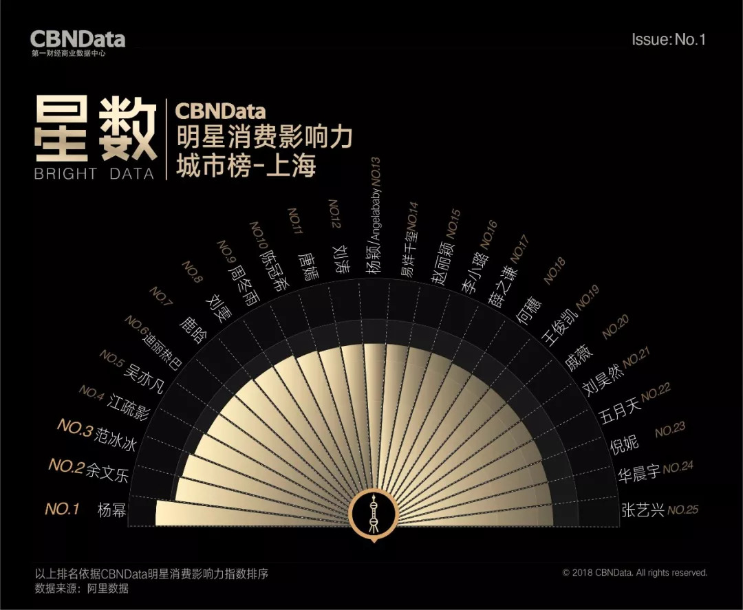 首期“CBNData明星消费影响力榜”基于阿里数据,以2018年第一季度为测算周期,发布了1个季度总榜、1个人气榜、1个效果榜、2个性别榜单、4个代际榜单、7个品类榜单及20个城市榜单,通过明星消费影响力指数,揭示明星在70后、80后、90后、00后不同年龄段,20个不同城市及七大生活品类的消费影响力,综合衡量明星消费价值。