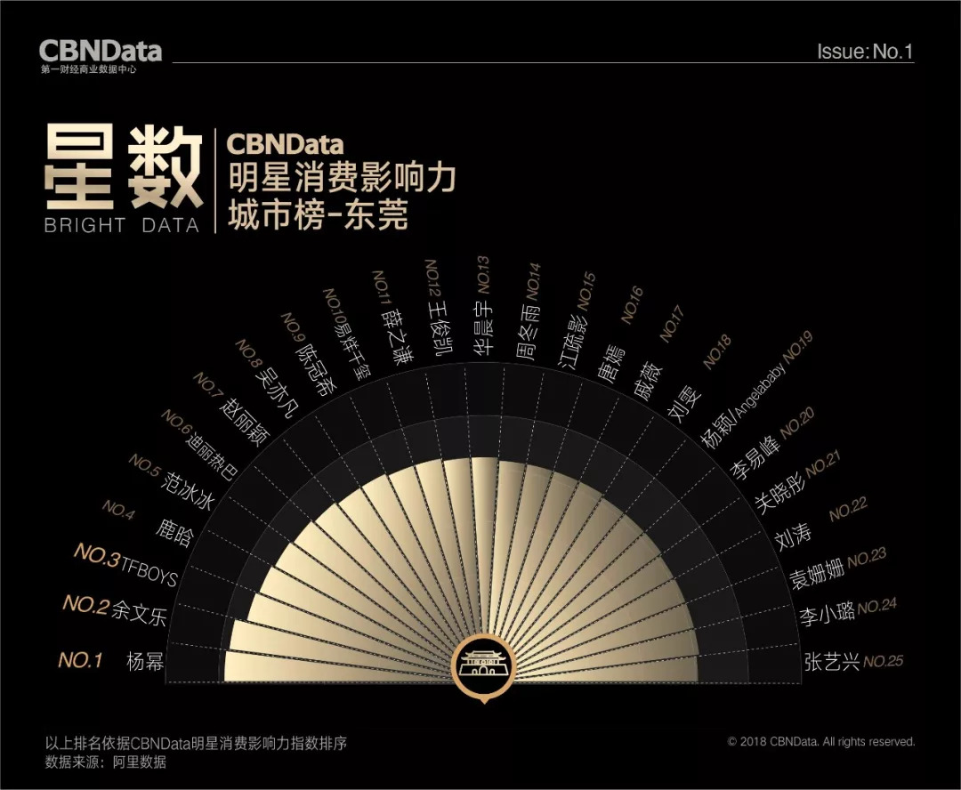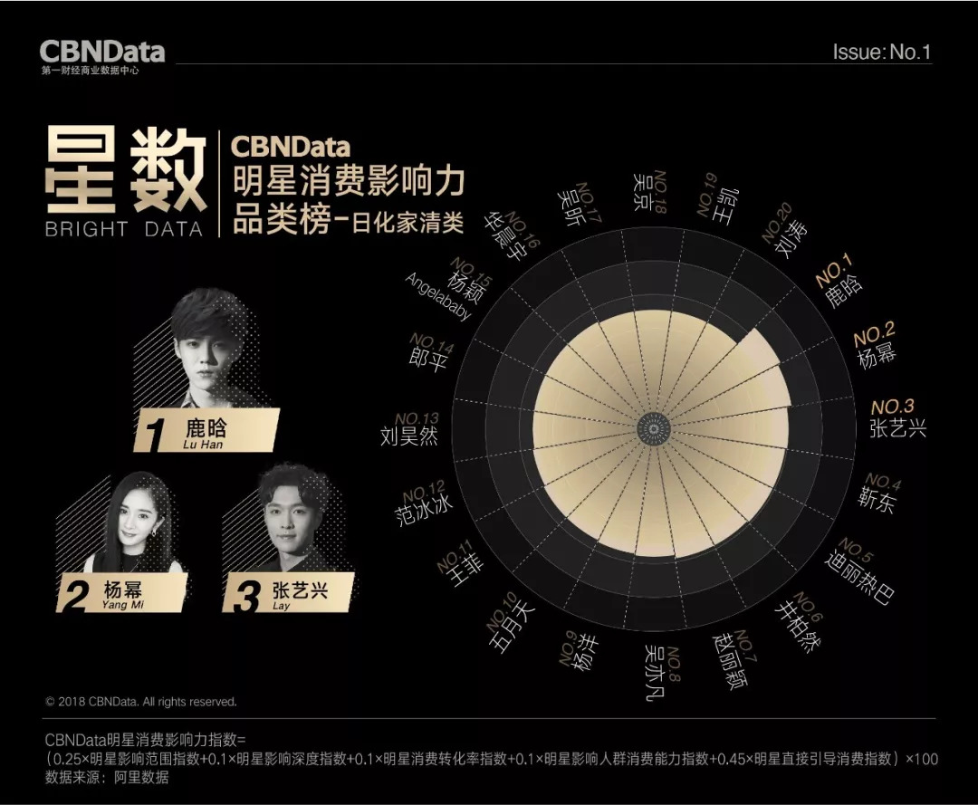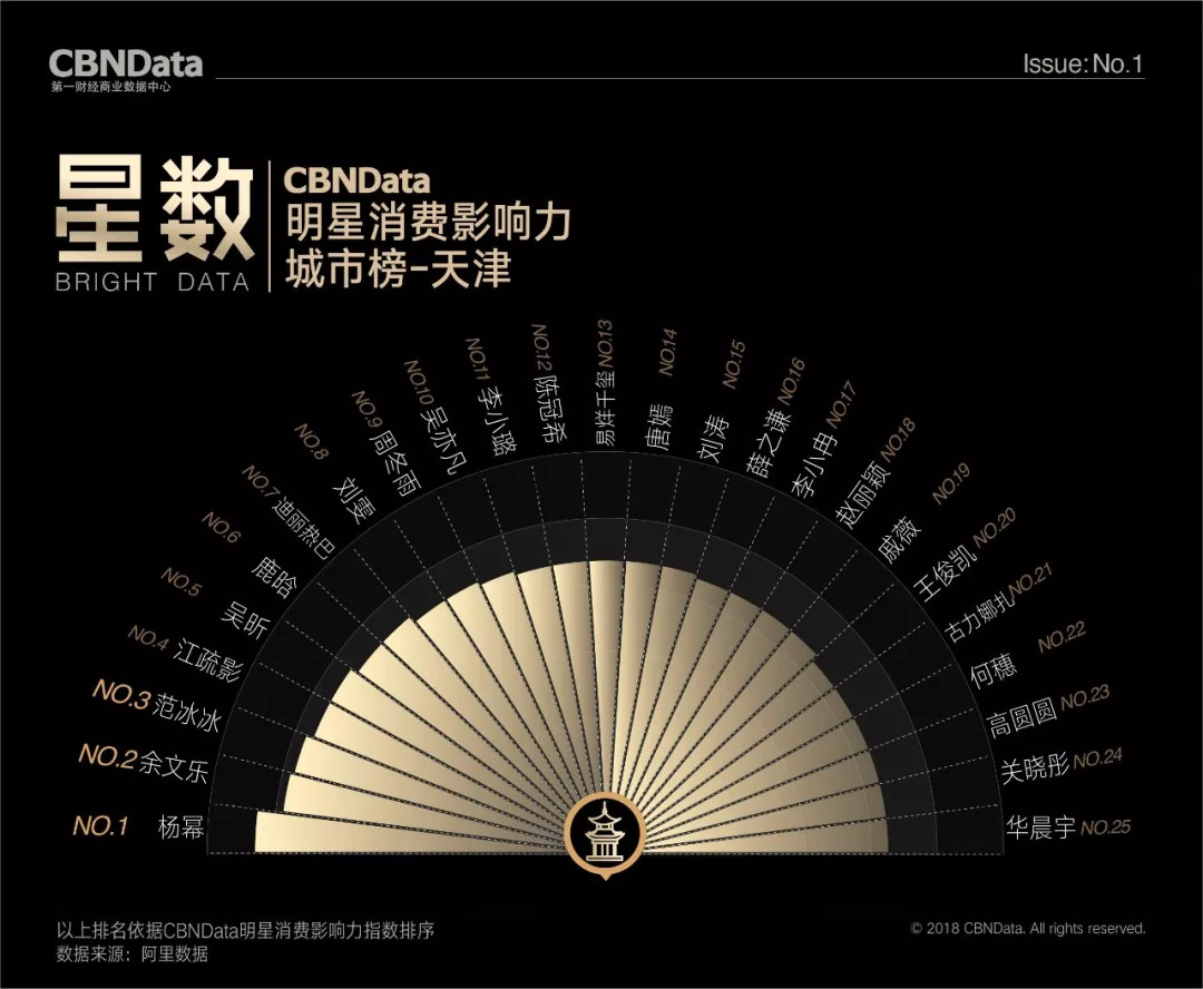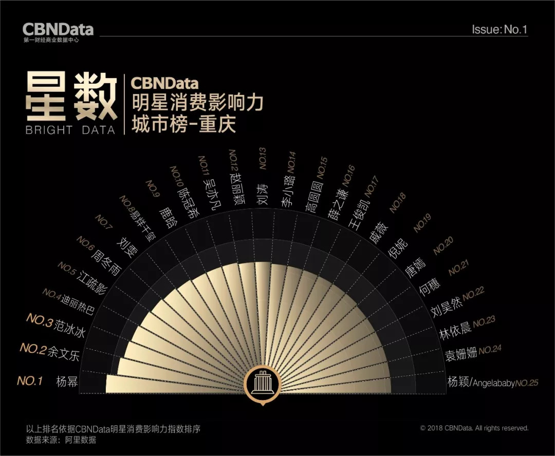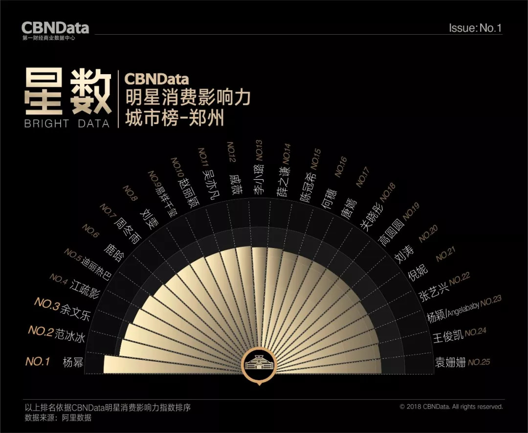 首期“CBNData明星消费影响力榜”基于阿里数据,以2018年第一季度为测算周期,发布了1个季度总榜、1个人气榜、1个效果榜、2个性别榜单、4个代际榜单、7个品类榜单及20个城市榜单,通过明星消费影响力指数,揭示明星在70后、80后、90后、00后不同年龄段,20个不同城市及七大生活品类的消费影响力,综合衡量明星消费价值。