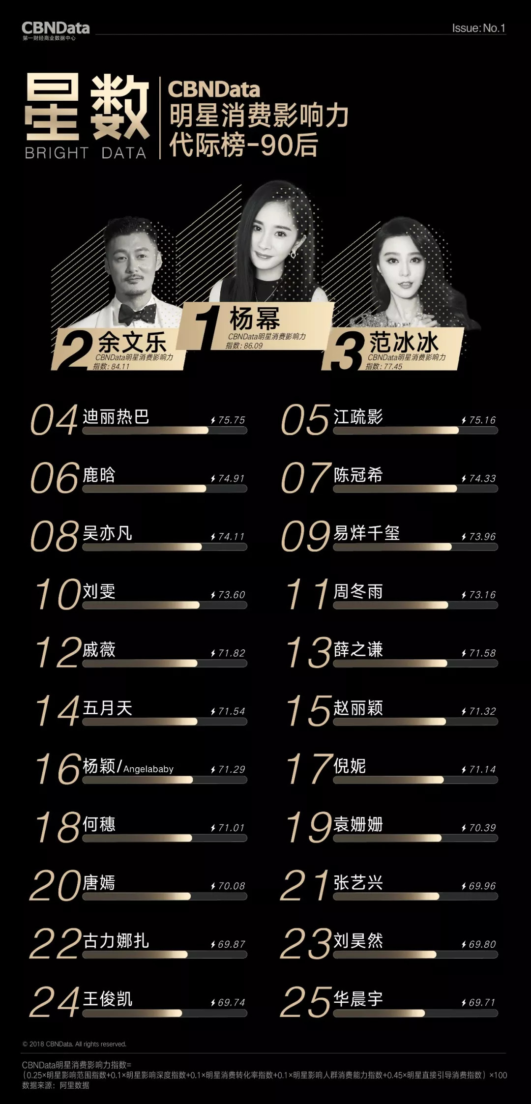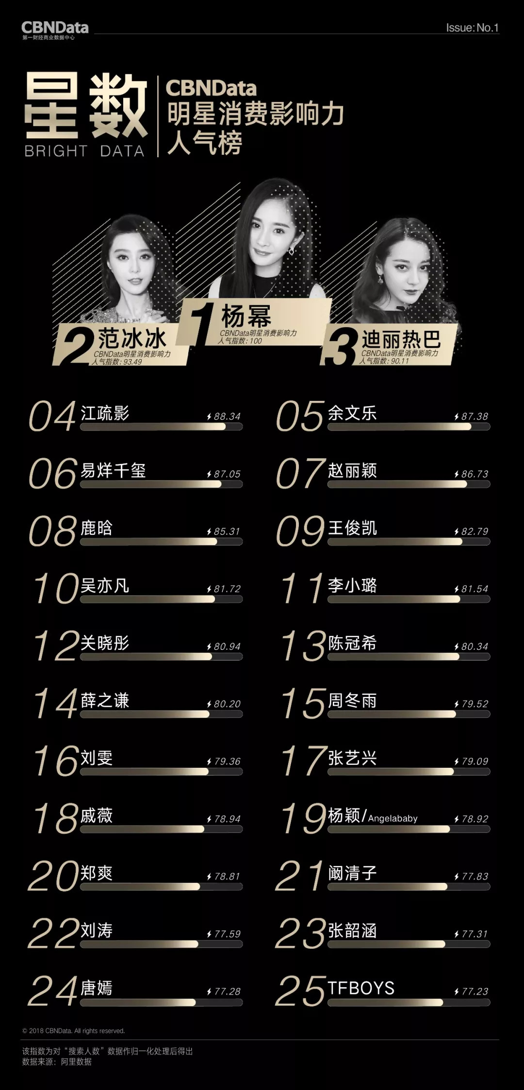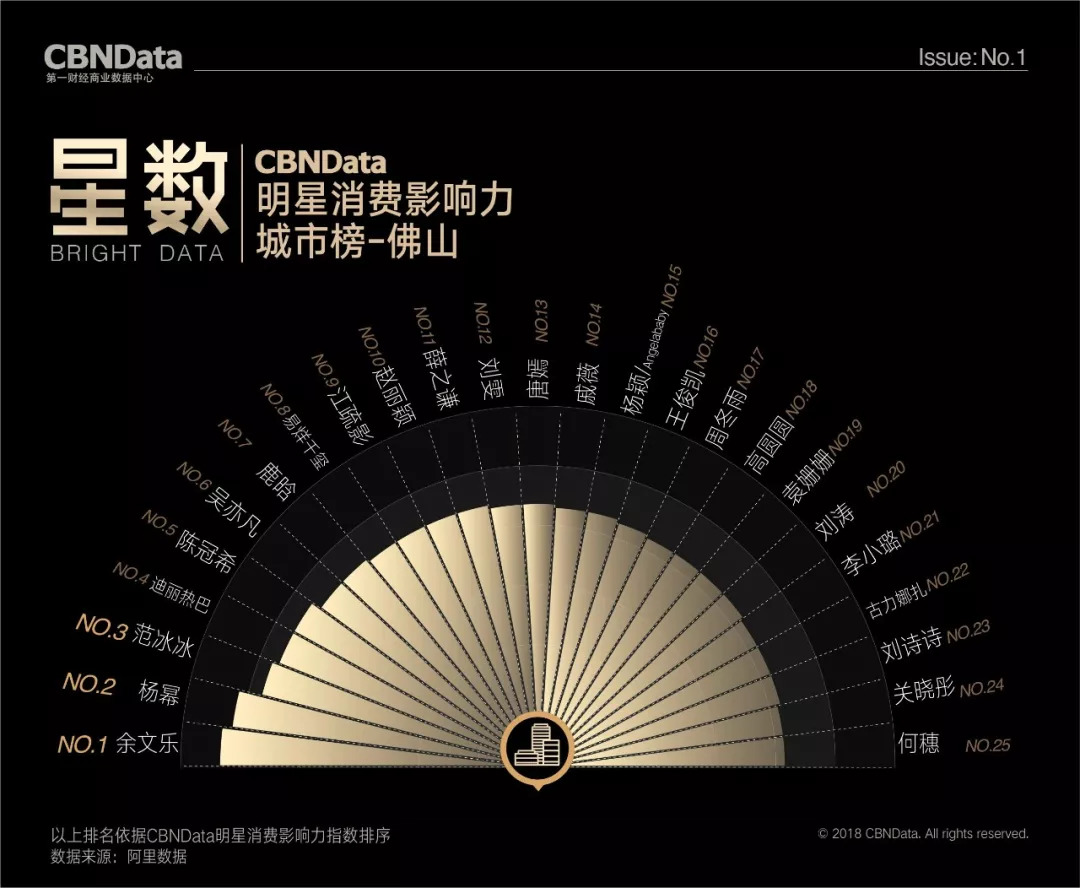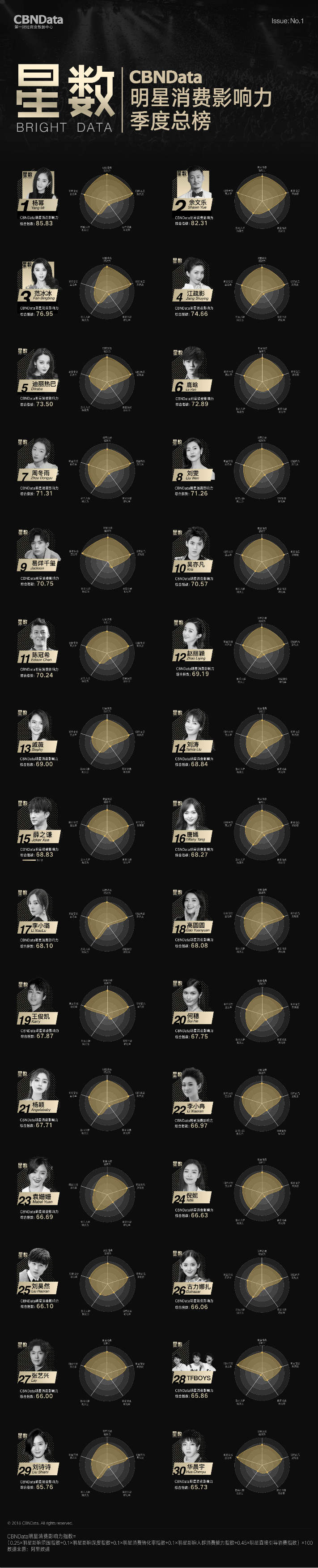 首期“CBNData明星消费影响力榜”基于阿里数据,以2018年第一季度为测算周期,发布了1个季度总榜、1个人气榜、1个效果榜、2个性别榜单、4个代际榜单、7个品类榜单及20个城市榜单,通过明星消费影响力指数,揭示明星在70后、80后、90后、00后不同年龄段,20个不同城市及七大生活品类的消费影响力,综合衡量明星消费价值。