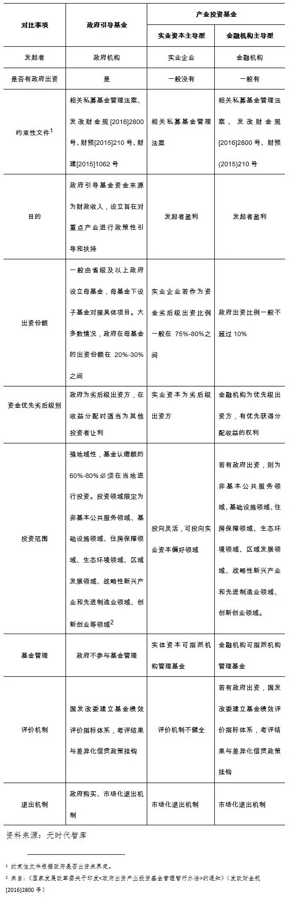 由于发起人不同,产业投资基金与政府引导基金在投向、运作等方面有较大差异,如下表。