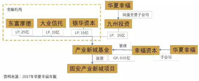 2017年11月,华夏幸福设立产业新城基金(京津冀一期),总规模75.01亿元,组织模式为有限合伙制。华夏幸福间接全资子公司九通投资与三家金融机构东富厚德、大业信托、银华资本共同担任LP(有限合伙人)。九通投资、东富厚德、大业信托、银华资本的出资份额分别为25亿元、25亿元、10亿元、15亿元人民币,目前出资方的优先劣后级暂未公布。华夏幸福全资子公司幸福资本担任GP(一般合伙人)管理基金,出资0.01亿元,当前幸福资本已取得中国证券投资基金业协会私募基金管理人登记证。