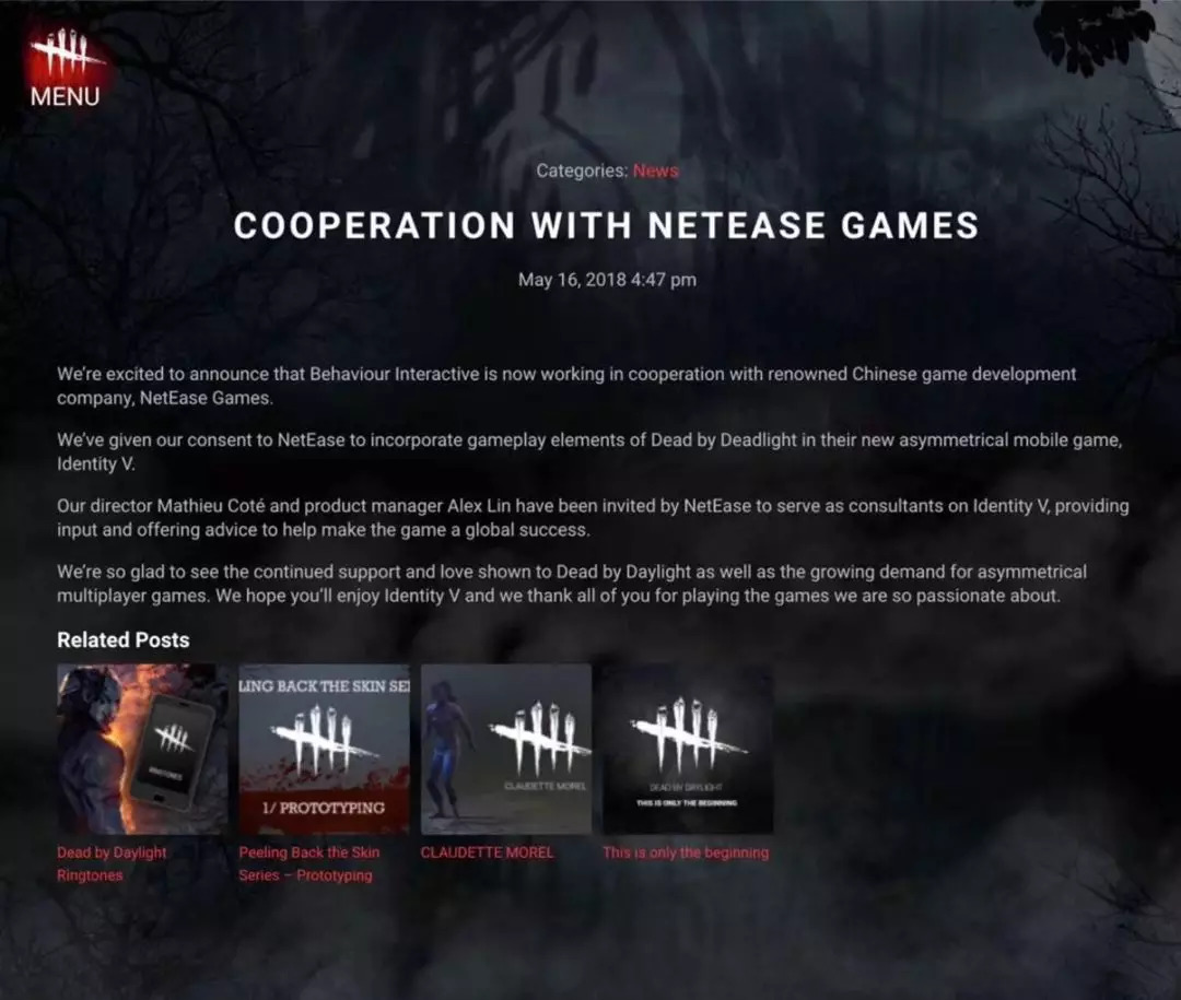 就在谣言四起的时候, 《黎明杀机》在官网发布了一则公告,明确表示了与《第五人格》合作在其上线前就已经达成。