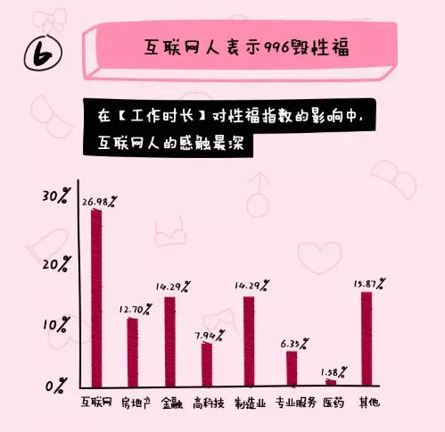 另外,其实成年人性生活不和谐也成了社会常态。网易春风联合猎聘发布的《职场人性福指数大揭秘》指出,职场人的“性福指数”与工作压力、工作时长、薪资状况等因素息息相关。而受紧张、快节奏的职场大环境影响,大部分职场人的性生活不尽如人意,超过七成的职场人坦言生活不“性福”,互联网行业从业人员尤甚。