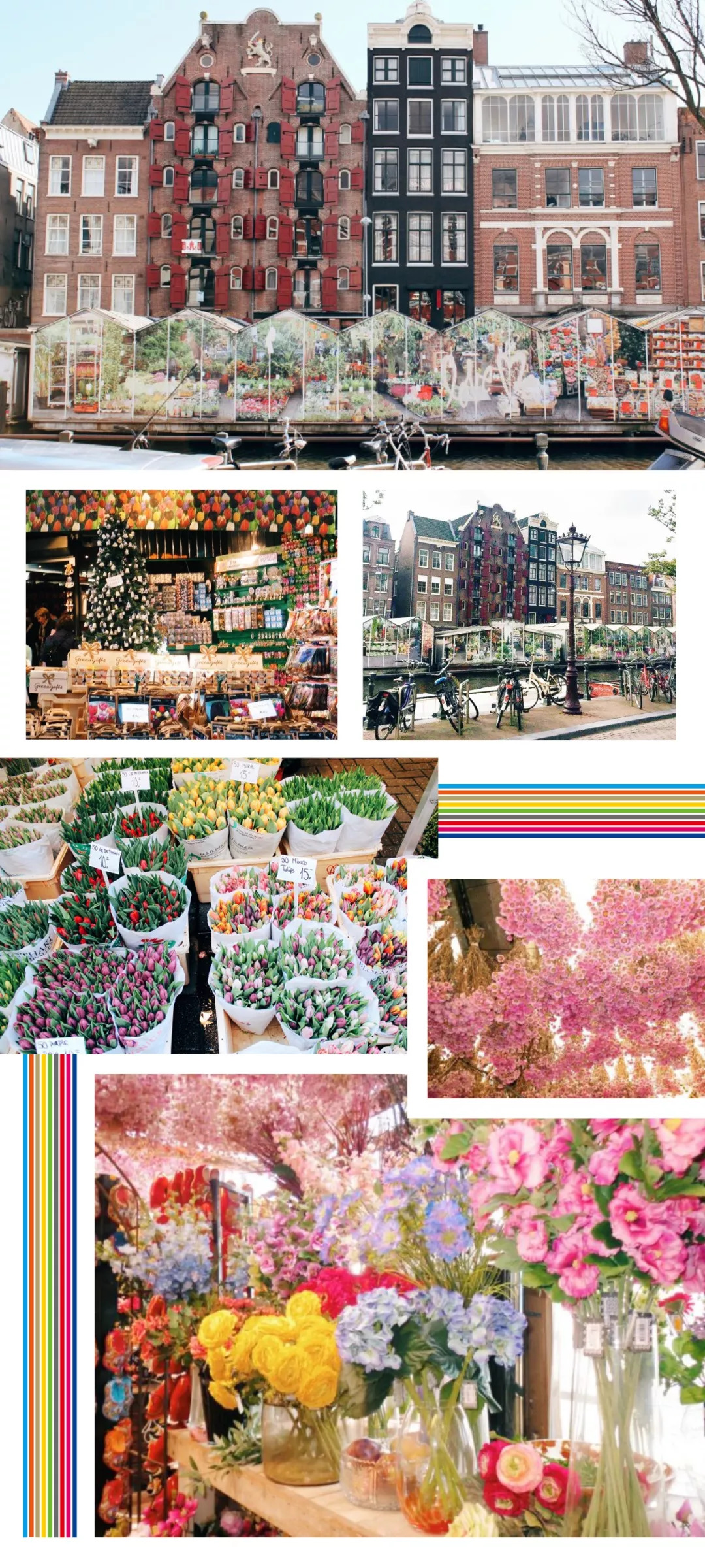 虽然平日里的阿姆斯特丹是被运河围绕交错出来的略显密集的城市,但在4、5月的花季中,整座城依然会沉浸在鲜花的绰约风姿里。从运河两岸到博物馆周围,从酒店到公共空处,甚至是在这座城市80万辆自行车中,都随处可见鲜花的点缀。