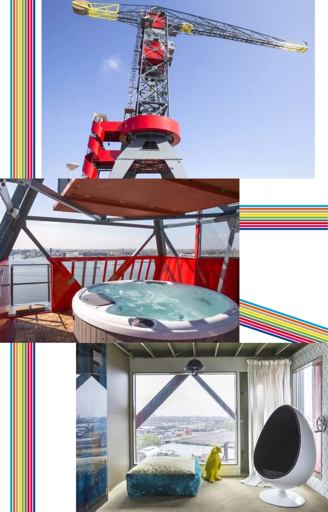 你没看错,这是一家由废弃的工厂吊车被改造成的酒店,只有3间套房分布在三个不同的高度层,都是由废旧机房改建的。虽然吊车是废弃了,但在其之上新生的酒店却是奢华级别的,套房均价在400欧左右一晚。客人甚至可以预约在吊车高架上用餐,腿抖的同时也能俯瞰阿姆斯特丹的运河与城市。