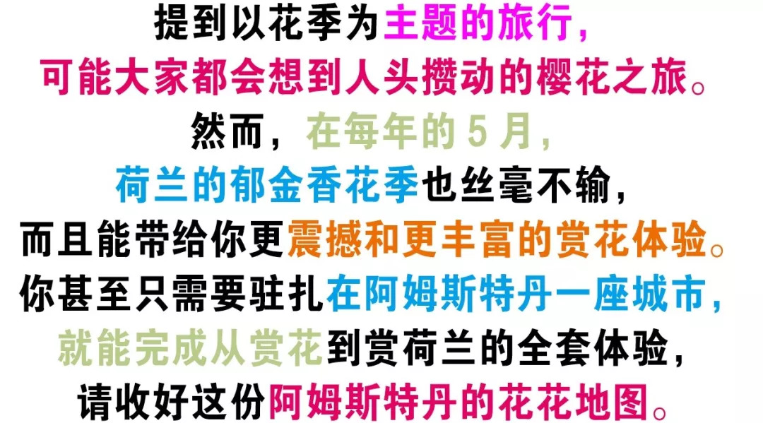 “郁金香天堂”、“自行车王国”、“风车王国”、“红灯区”……荷兰的旅行标签总是人感到自由和眼花缭乱。而阿姆斯特丹作为荷兰最大的城市也无疑有着所有能够代表荷兰的标签,以阿姆斯特丹为圆心,有很多路线都能让你一日之内发现荷兰的花季。