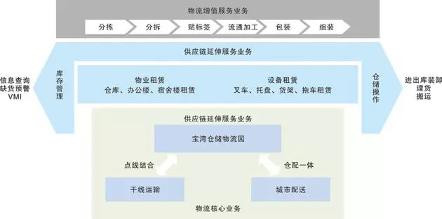 增值服务则包括物流增值业务(分拣、分拆、贴标签、流通加工、包装、组装),供应链延伸业务(库存管理、仓储操作),物流租赁业务(物业租赁、设备租赁),和物流核心业务――以宝湾仓储物流园区为中心的干线运输与城市配送。