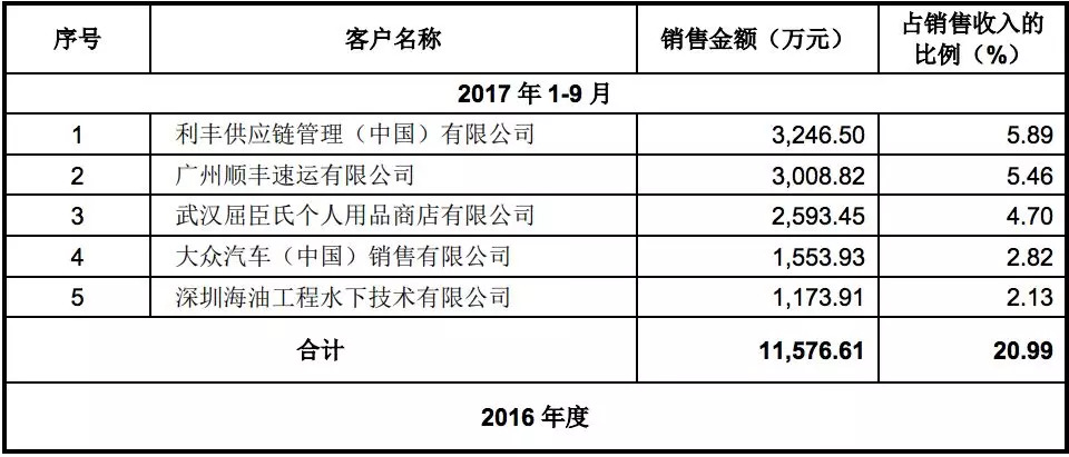 以下是宝湾物流的母公司深基地2016年和2017年前五名客户的基本情况。除第五名深圳海油工程水下技术有限公司是深基地在石油后勤业务方面的客户,前四名都是宝湾物流的客户。