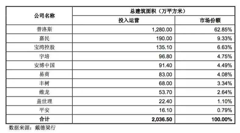 根据戴德梁行统计,按照已完工、在运营物流园区面积统计,宝湾物流在整个中国物流地产的市场份额排名第三,占整个物流地产市场的6.63%,前两位是两大外资巨头普洛斯和嘉民;如果再算上在建物流园区面积的话,第三名是中国物流资产,宝湾物流则排名第四。
