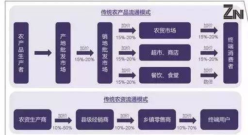 在《2017中国农业互联网化研究报告之中国农业互联网化模式分析》报告中指出,在传统农产品流通模式中,农产品从生产商到消费者手中要经过各级经销商、批发商、分销商,每个环节加价15%-20%不等,而在农资流通环节,则加价10%-70%不等。