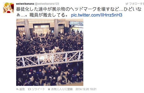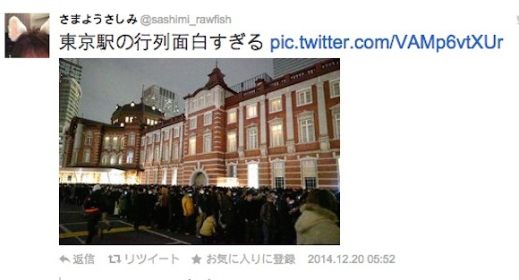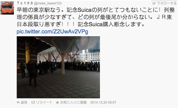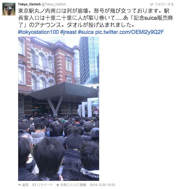 “东京站丸之内南口的队伍崩溃了。都在骂人。站长室被重重包围。广播说不出售纪念西瓜卡了。还有人扔了毛巾进去!”