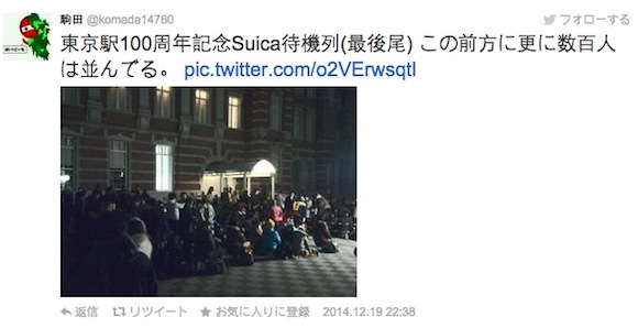 事情是这样的。这天早晨,原本预定从8点开始出售纪念版西瓜卡,不过,刚过七点,东京站前就排起了9000人的长龙!下面这张Twitter图是19日晚22:38发的。