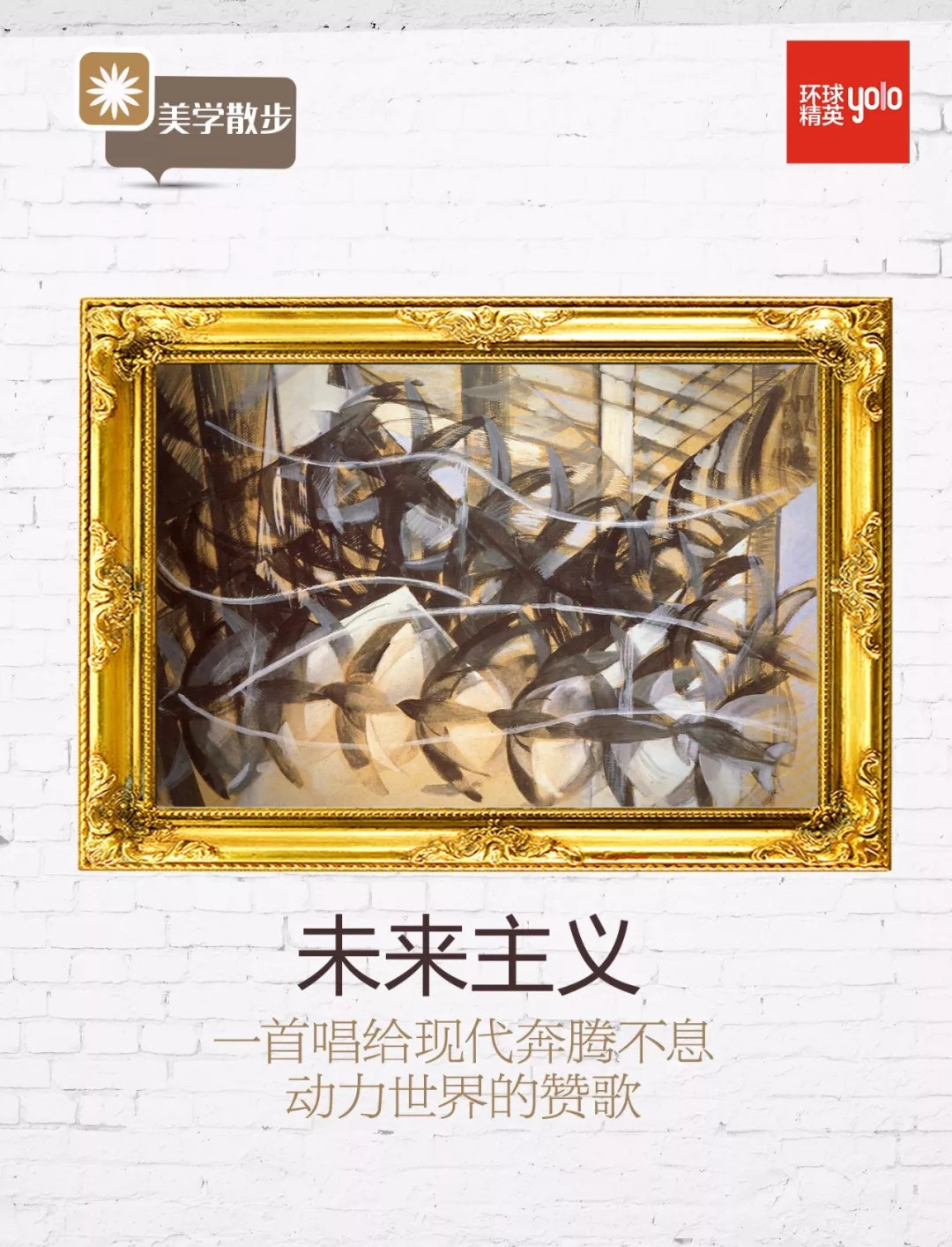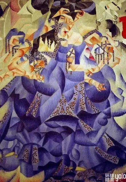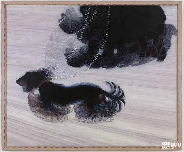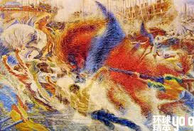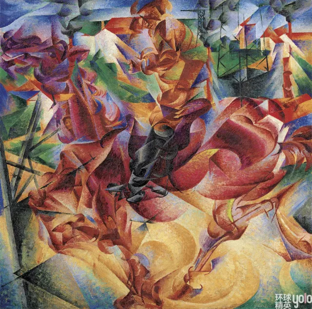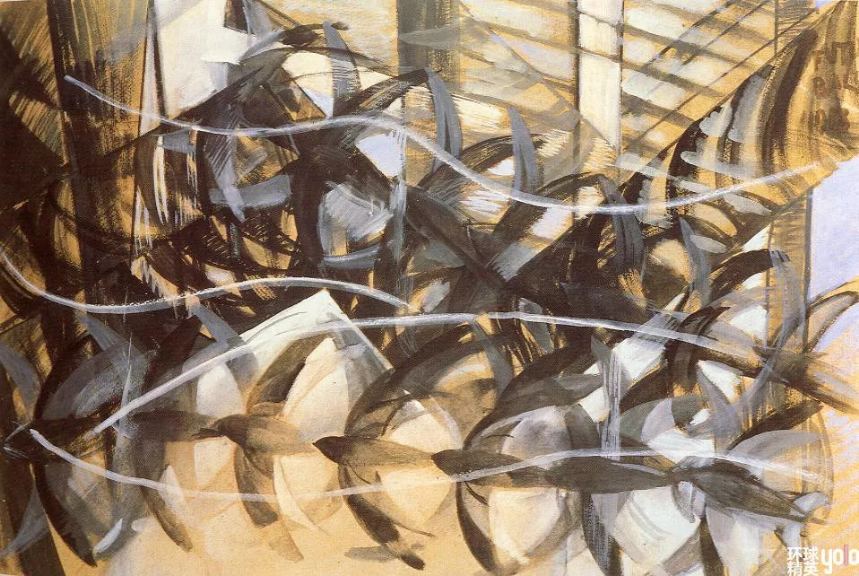 在高速行驶的机车处、马达隆隆的噪音中,他们看见了革命的力量,迷恋于现代工业的动力之美,尤其显示出对超高速度的迷恋。20世纪各种先锋艺术都以扰乱线性时间为己任,而未来主义更是一剂强心针,使艺术在时间性上前所未有的狂暴、膨胀。这种力量与速度的结合在未来主义画作中就呈现为错乱交错的叠影与光弧,表现着战争、跑车……