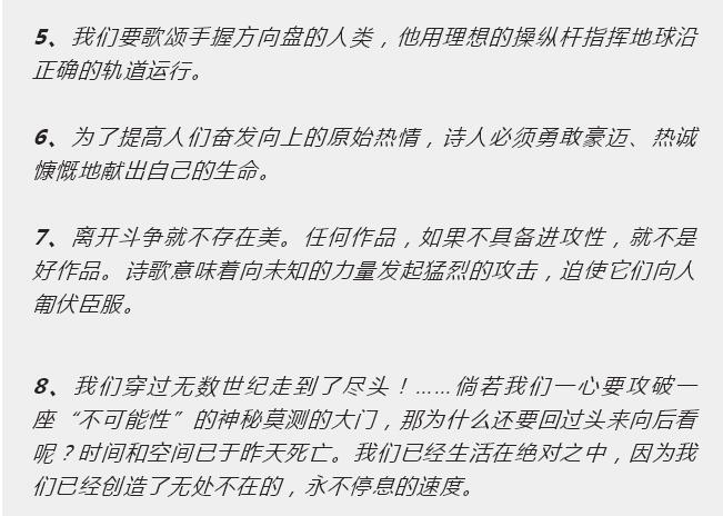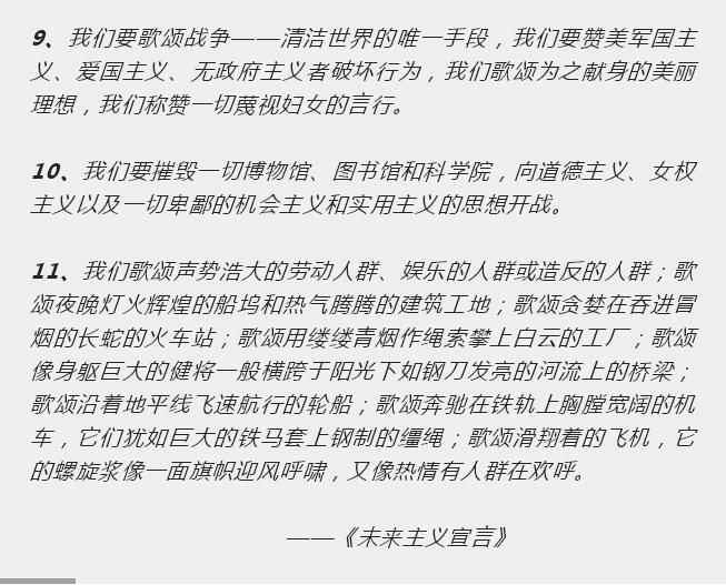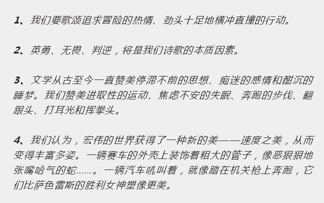 在《未来主义宣言》马里内蒂中总共提出了十一条宣言,并成为了未来主义的行动方向: