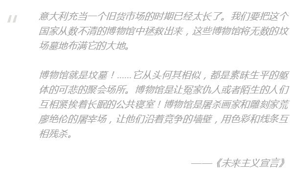同时,马里内蒂有发表了一篇更为著名的《未来主义宣言》,提出未来主义的成立,“目的是要切除这个国家肌体上生长着的由教授、考古学家、导游者和古董商们组成的臭气熏天的痈疽”。