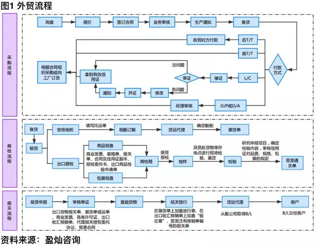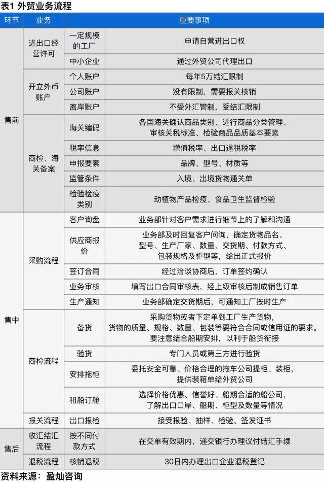 外贸业务流程分为售前、售中和售后环节。售前环节需要进行一些准备工作,例如办理进出口经营许可、开立外币账户、商检及海关备案等。售中环节主要包括采购、商检和报关流程。售后环节分为收汇/结汇和退税流程。