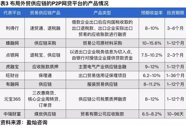 下表3中列举了上述8家布局外贸供应链的P2P网贷平台产品情况,包括产品名称、产品类型、预期收益率和投资期限。