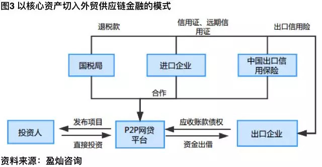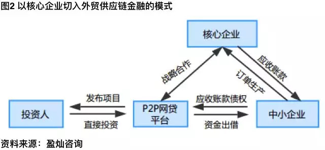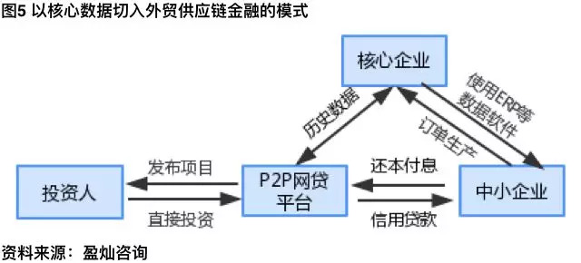 以核心企业切入外贸供应链金融,其模式是基于我国外贸产业链上的相关企业融资需求,以核心企业的上下游为服务对象,将资金注入处于上下游中小企业,解决中小企业融资难和供应链失衡的问题。平台通过为外贸行业的中小企业融资,与供应链核心企业达成战略合作。同时,平台还可以通过获取核心企业上下游的生产和销售数据,来完成定价、风控等措施。