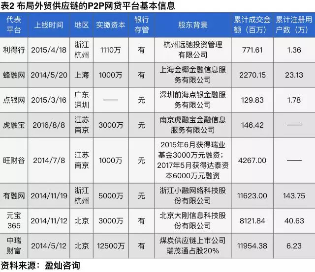 下表2中列举了布局外贸供应链金融的8家P2P网贷平台的基本信息,包括上线时间、所在地区、实缴资本、银行存管情况、股东背景、成交金额及注册用户数。
