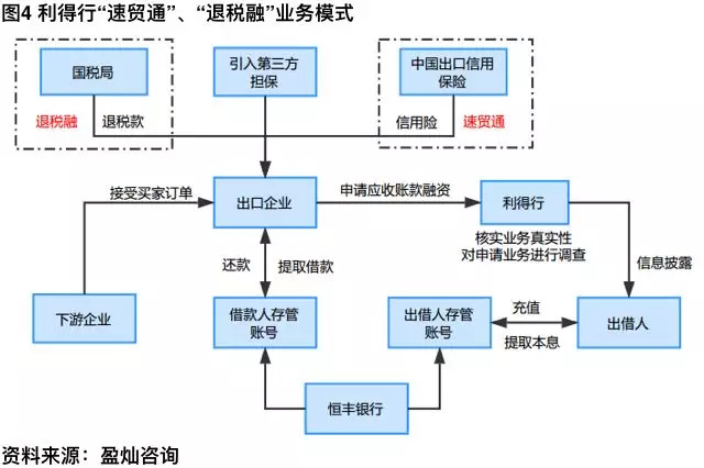 以供应链金融服务平台利得行为例,其开展了基于债权出口退税融资等业务,将互联网金融与跨国贸易领域紧密地结合在一起,形成完整的贸易供应链金融链。平台的外贸融资服务主要包括出口订单融资、退税融资和信保融资,即外贸出口企业通过出口订单、国家退税相关材料和投过保单的货物单据通过平台融资。 产品“速贸通”和“退税融”是基于出口企业实际出口贸易的应收款和退税款进行融资,可以增强企业资产流动性,帮助实体企业解决贸易过程中的资金短缺问题。在风控方面,平台构筑起了基于外贸行业物流、信息流、资金流的闭环风控体系,并且通过出口信用险进行贸易保障。