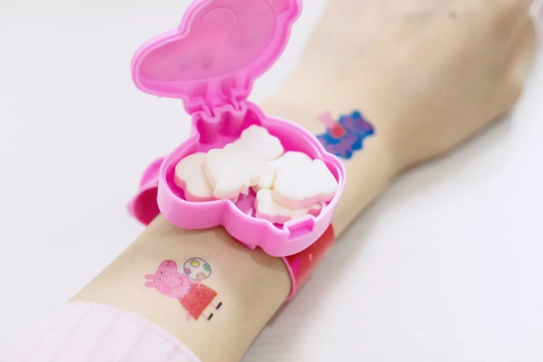 表体以2018年流行色——佩奇粉为主色调,表盘采用小猪佩奇大头照,简约又不失风格。下方设有暗扣,打开之后别有洞天,你一定想不到它里面还可以放奶片……