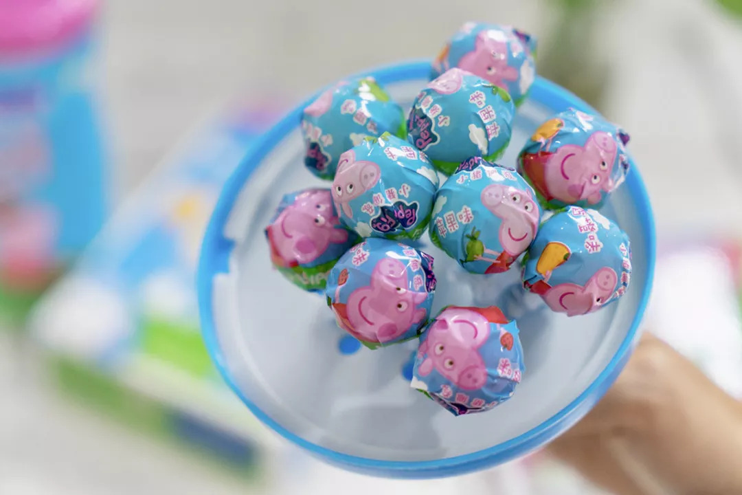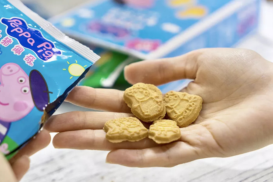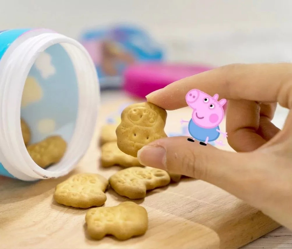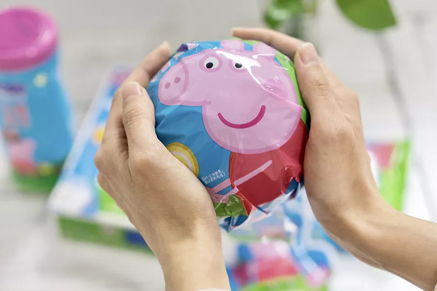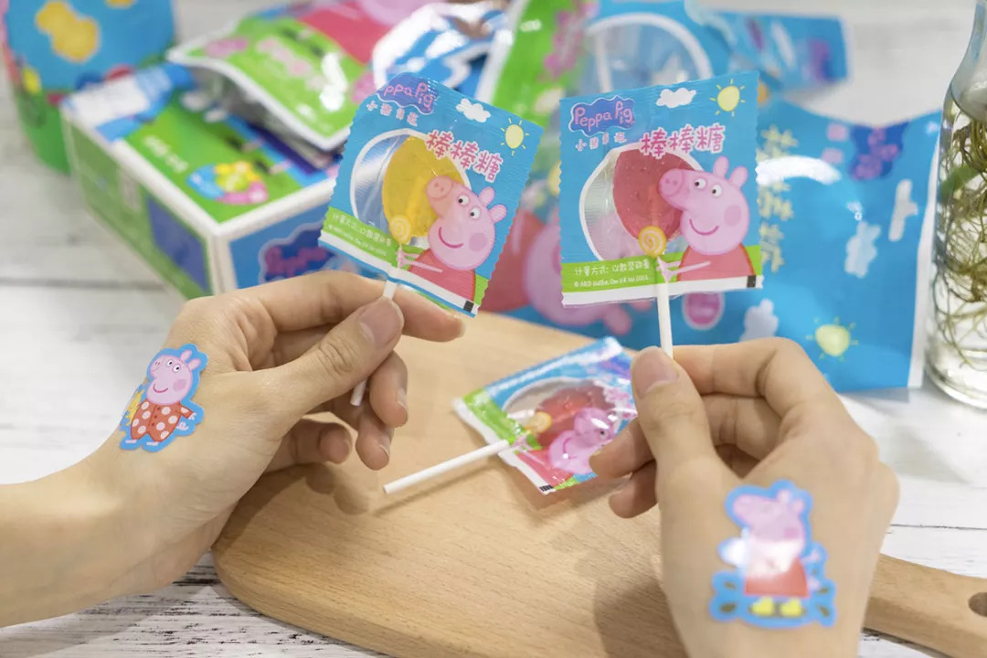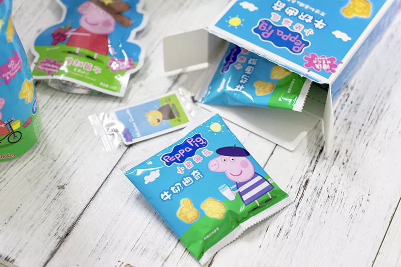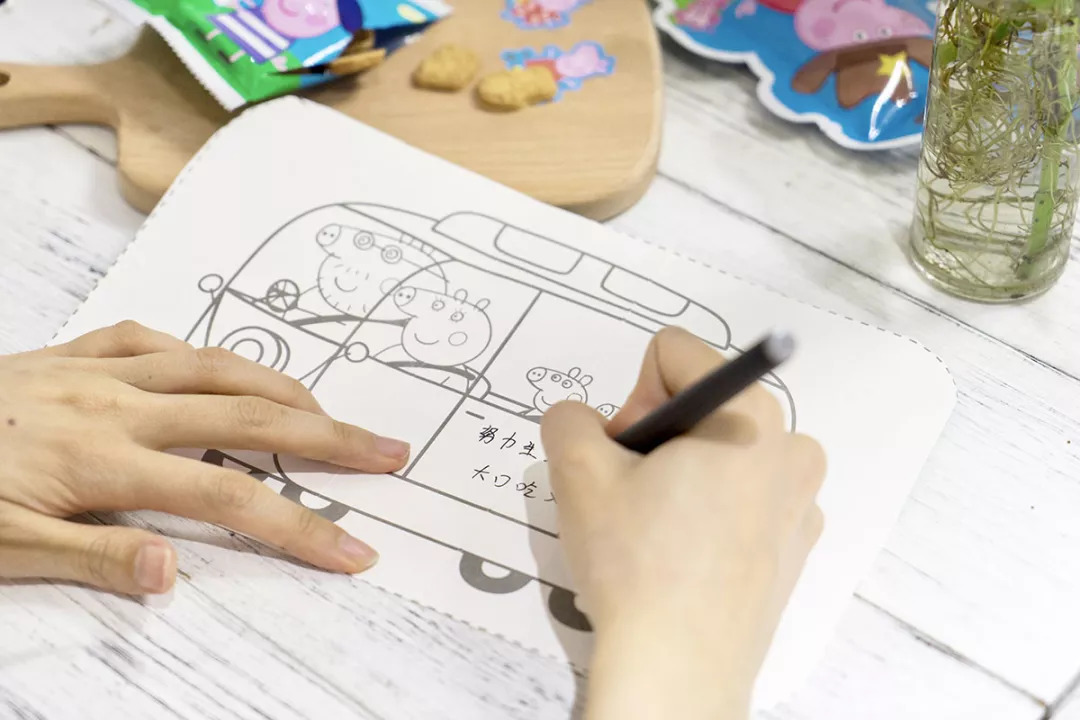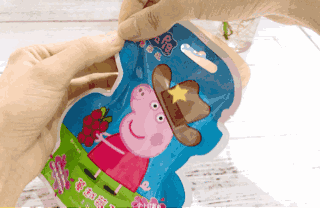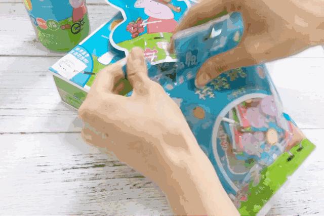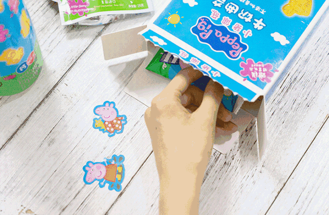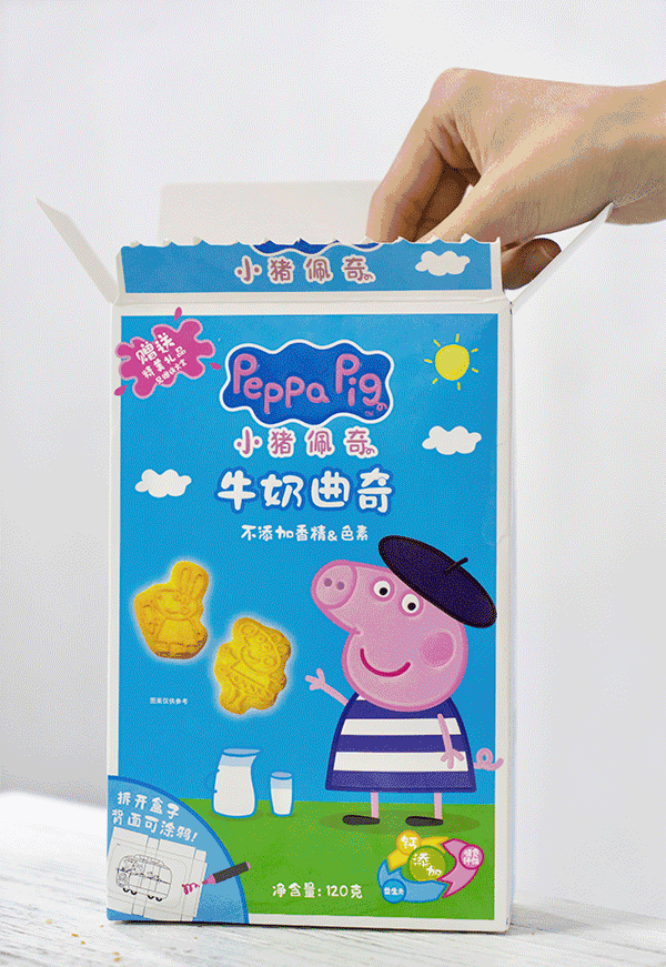 而且,这款零食还有惊喜!拆开纸盒,里面有印着小猪佩奇的卡通图案,社会人可以用彩色笔涂鸦,神操作!