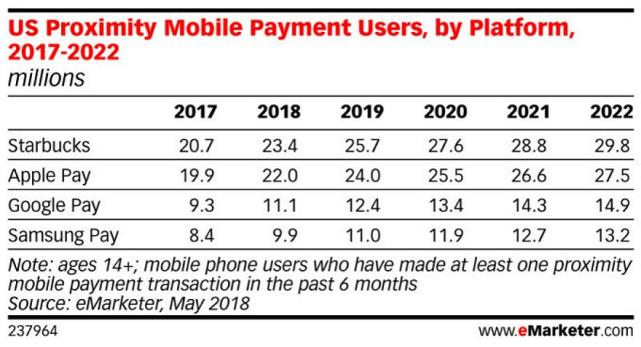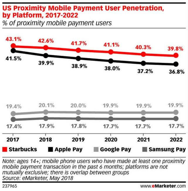 eMarketer报告称,星巴克自2011年以来一直运营自己的移动支付服务,目前处于市场领先地位,击败了Apple Pay,Google Pay和Samsung Pay。