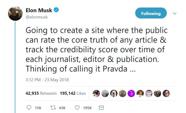 23日,马斯克在其个人Twitter上连发多条推文,称自己“将创建一个网站,在这里公众可以对任何新闻文章的核心真实性进行评价,并且追踪任何一名记者、编辑及发行机构的信用分数“,他甚至还为这一网站起好了名字”Pravda“,是俄语”真理“的意思。