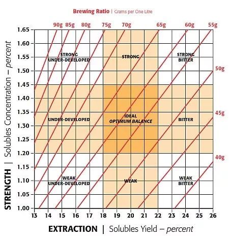 手冲咖啡有一个“金杯咖啡理论图表”,通过精准的水温、萃取时间,能够冲出一杯最佳的咖啡。