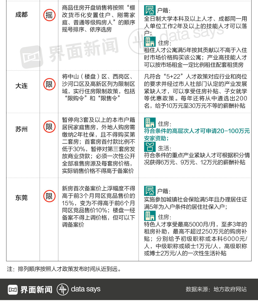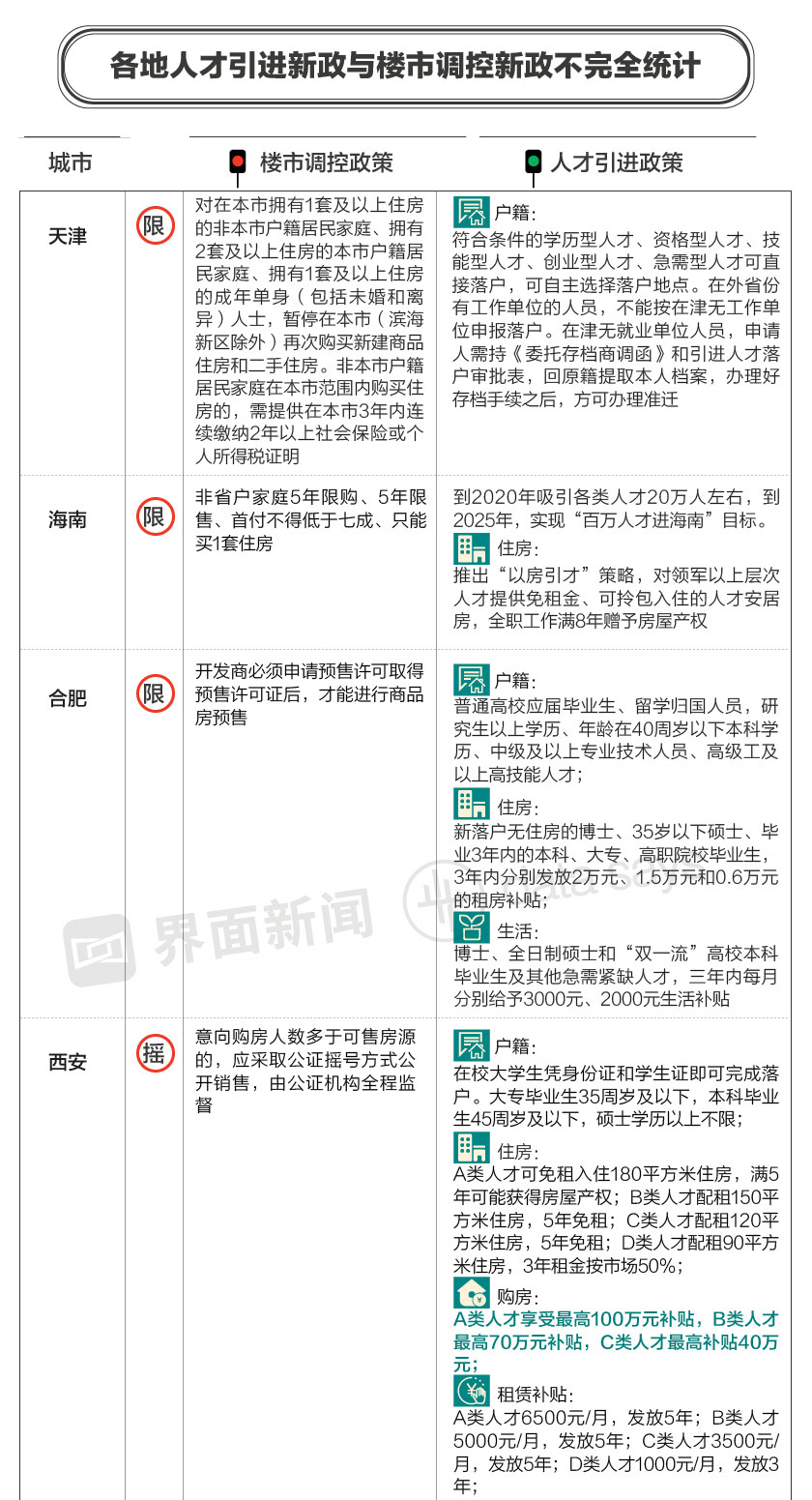 同时,各大城市上演“抢人大战”,相继出台一系列人才引进政策,包括降低户籍准入、提供住房福利、促进就业创业等,其中不少地区还提供各种形式的购房补贴。
