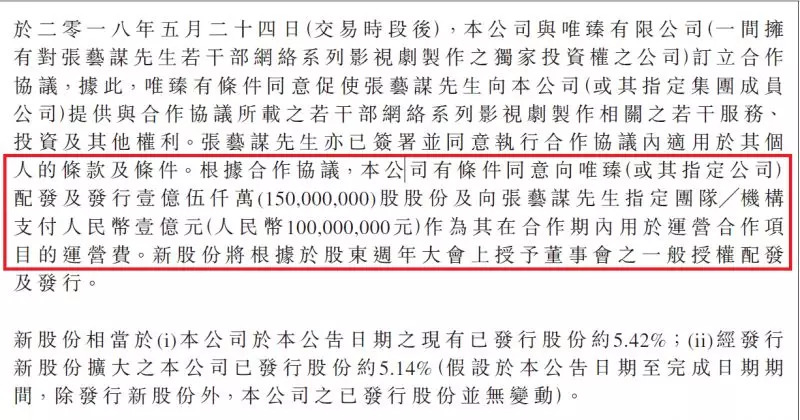 欢喜传媒公告显示,唯臻(或其指定公司)(一间拥有对张艺谋先生若干部网络系列影视剧制作之独家投资权之公司)占股欢喜传媒5.14%,这显然比乐视更有诚意。