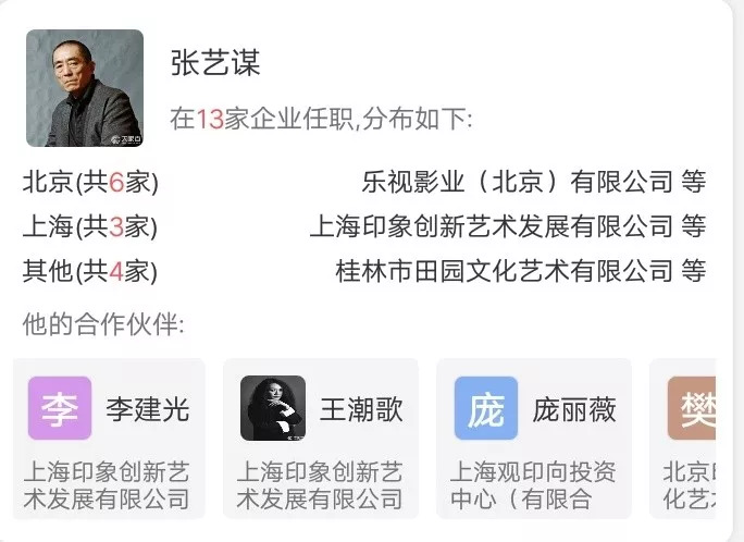 此外,据天眼查消息,张艺谋参与入股的公司高达10余家,其中担任法人的公司为5家,担任股东的为10家公司,担任高管的为4家公司,作为合作伙伴的有5家公司。
