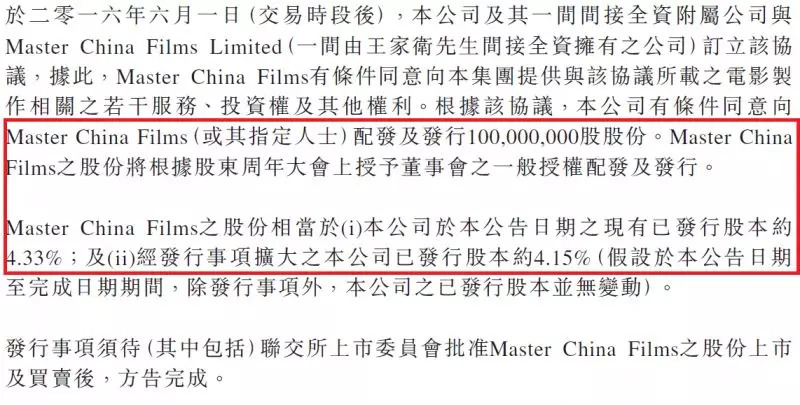 欢喜传媒此前分别向王家卫、陈可辛、顾长卫及张一白配发1亿股、1.445亿股、7500万股及1.4亿股新股,分别占公司扩大后已发行股份的3.92%、5.66%、2.71%及5.06%。