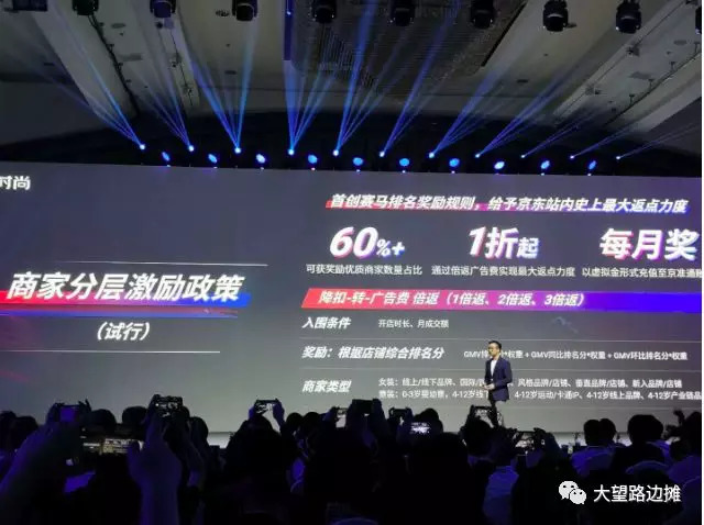 胡胜利采用的方法是将商家分层激励,把商家划为不同的档位来进行“赛马”,通过倍返广告费的形式实现最大返还,这样做的好处在于,京东平台的商家只需要与同一层的商家,即同一种风格、同一种能力的商家赛跑。赛道细分,奖励跳一跳就能够到。广告费最低可到1折,且将有60%以上的商家获得奖励。胡胜利表示,这是京东站内史上最大返点力度。