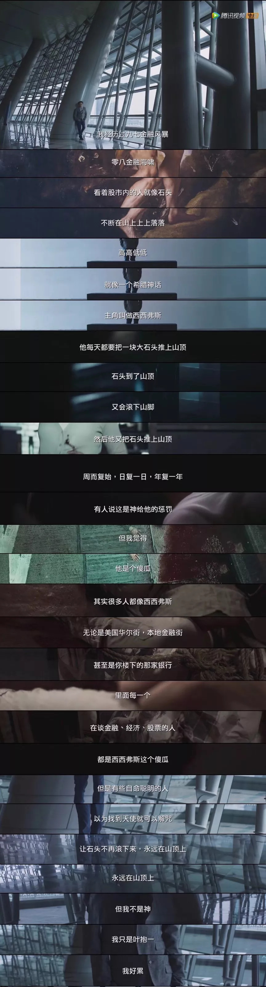 叶抱一有着类似西西弗斯不停推石头的宿命,他想要制定金融世界的规则。人生就是不停推石头上山,这件事情看起来很荒诞无界,周而复始,可如果不推石头,那又用什么来证明他的存在?韦航呢,是对抗者也可能是一枚棋子。他们翻云覆雨,股市大起大落,包括主角在内的每一个民众其实都被裹挟在时代洪流里。