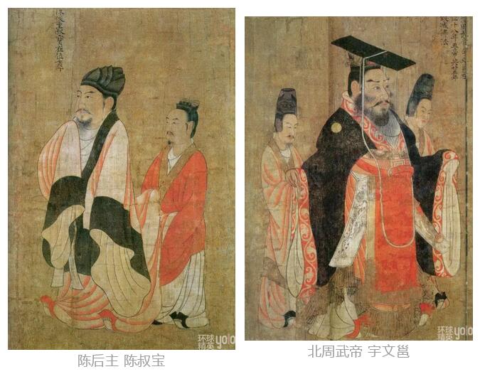 《历代帝王图》中的十三位帝王按历史顺序依次是:前汉昭帝刘弗陵,汉光武帝刘秀,魏文帝曹丕,吴主孙权,蜀主刘备,晋武帝司马炎,陈宣帝陈顼,陈文帝陈蒨,陈废帝陈伯宗,陈后主陈叔宝,北周武帝宇文邕,隋文帝杨坚,隋炀帝杨广。