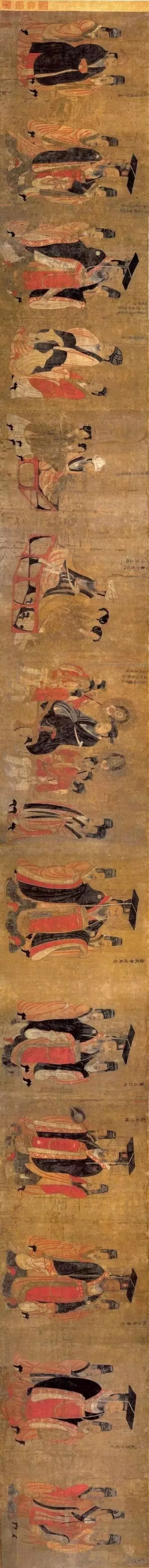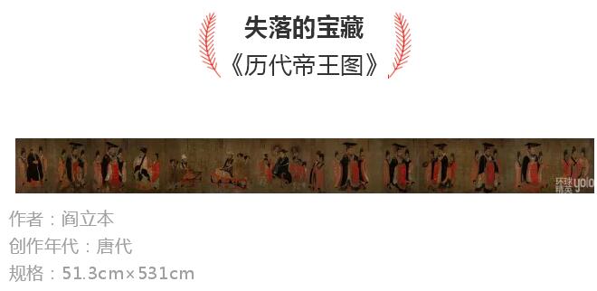 《历代帝王图》是唐代画家阎立本人物画的代表作,又称《古帝王图》。此图绢本,设色,纵51.3厘米,横531厘米。全卷共画有自汉至隋十三位帝王的画像,画卷的本幅未见名款,其拖尾部分有北宋、南宋时期及清代以来的多家题跋,在北宋以来定为初唐阎立本之作。(文末附有《历代帝王图》大图,可将手机横过来欣赏。)