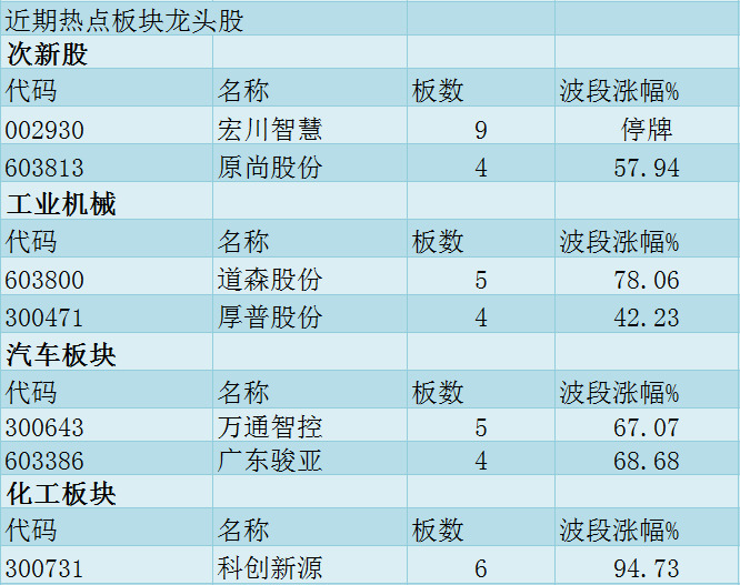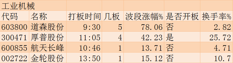 上涨情况:工业机械板块龙头深冷股份今日停牌,即便如此,盘中还是有4只工业机械板块个股涨停。道森股份凭借5个涨停板成为了新的龙头。