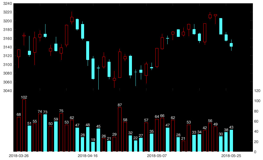5月25日(周五)上证指数低开后盘中震荡下挫,午后指数最低触及3131.07点,截至收盘,报收3141.3点,指数跌破3150点支撑位,跌幅为0.42%;中小板和创业板的跌幅更为惨重,分别为1.21%和1.84%;两市上涨的个股数量只有961只,远少于下跌的2274只。板块方面,汽车板块继续领涨两市,此外,猪肉、酿酒板块的市场表现也较好。个股方面,两市共43只个股涨停,其中新股有5只,涨停的老股中,沪市主板有15只,深市主板有1只,中小板有11只,创业板有11只。