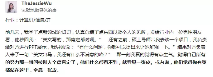 很多人说,思想低俗的人才会带着偏见去看女生。但是类似的事情同样出现在思想开明的高校。