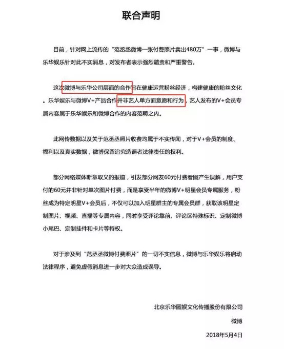 虽然事后范丞丞所在公司乐华娱乐发表声明,澄清这是公司与微博推出的合作活动,并非艺人单方面意愿和行为。