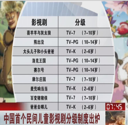 有关动画分级制度业内多有讨论,但至于官方标准一直未成形,直至去年4月爆出一幼童模仿《喜羊羊与灰太狼》剧情做“绑架烤羊”游戏的恶俗事件,引发20多家动画机构的“联合上书”,终于催生了号称民间1.0版的《中国儿童影视剧分级标准》。