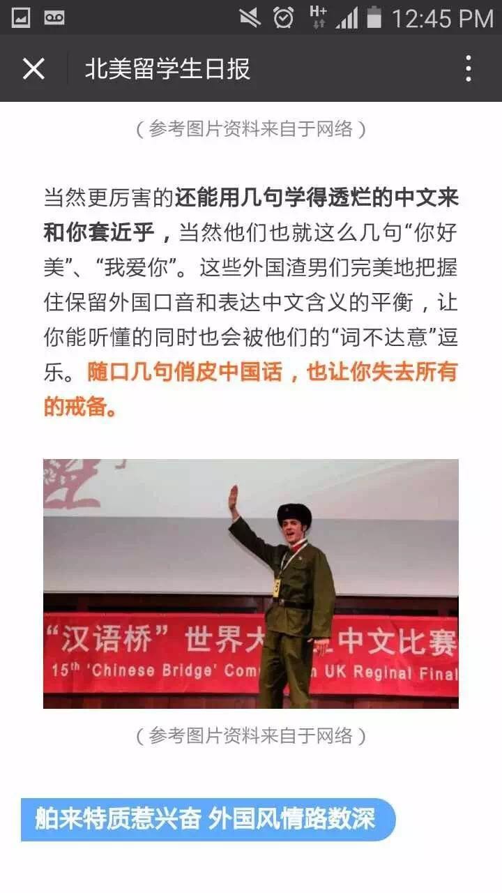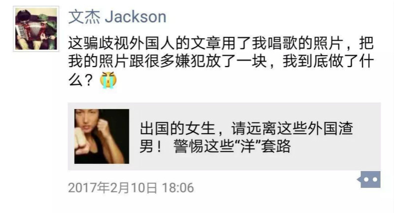 去年2月,北美留学生日报发了一篇名为《出国的女孩,请远离这些外国渣男!警惕这些洋套路》的文章,文章讲述各类品行不端的渣男用套路欺骗中国女留学生的事,阅读量达十万加,然而,文章中的一张配图却引起了很大争议,一位中文名叫文杰的英国男孩参加中国某比赛的照片被当作渣男照放在了文中,并配了些言语激烈的文字,文杰感觉很委屈。