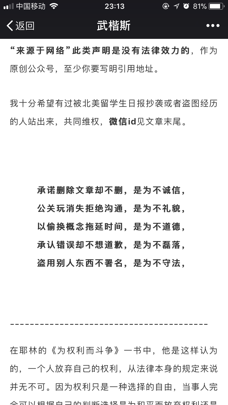 “之后又有一位朋友,写的文章被北美留学日报几乎全文抄袭,当时那位朋友去交涉了,北美留学日报就是耍赖,说自己哪怕是从观点到例子到结构都一模一样,那也只算是巧合,不是抄袭。我们当时都有帮忙转发,希望引起重视,然而人微言轻,最后只能不了了之。”
